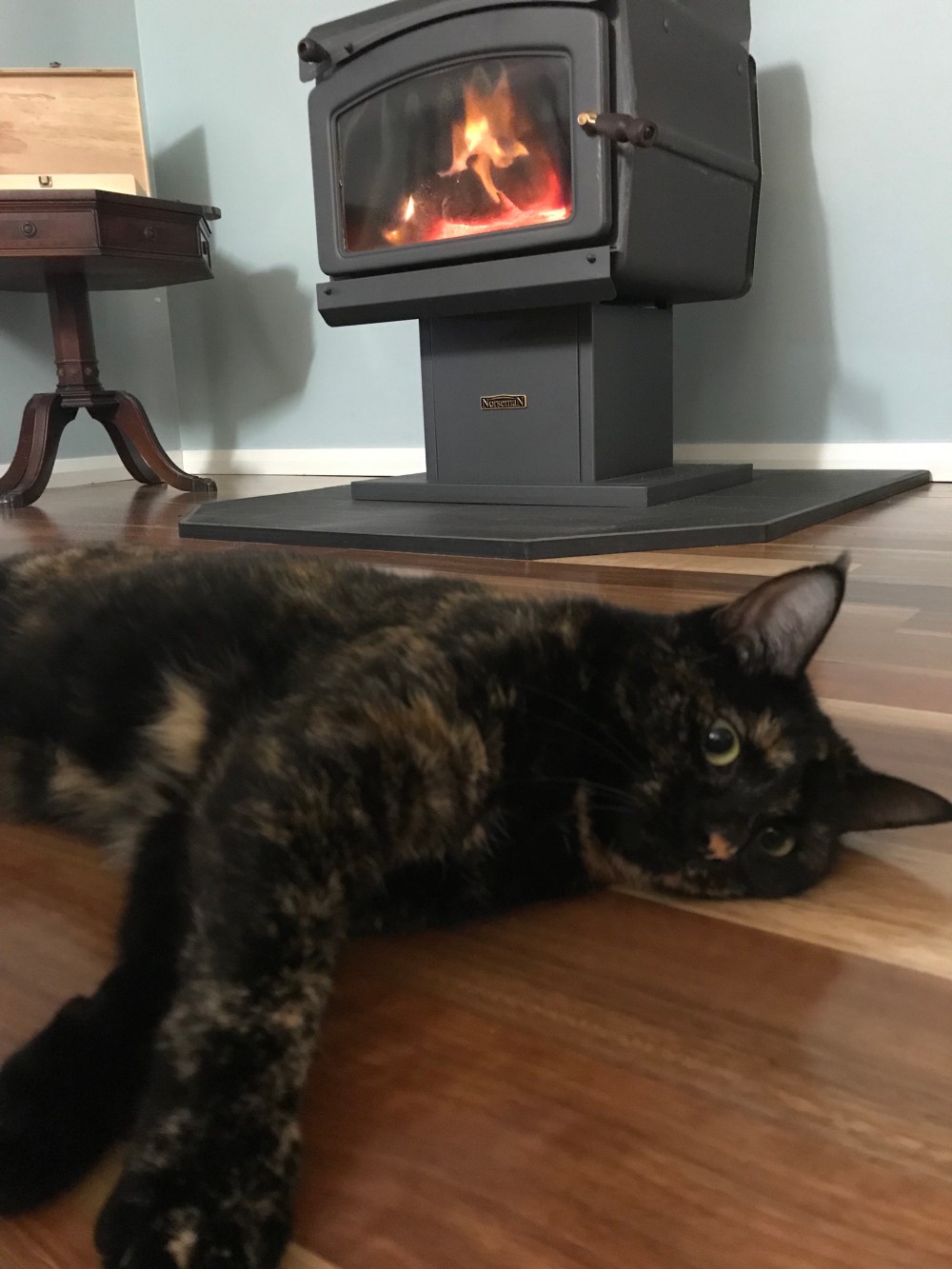 She seems rather happy to have the fire on again too!