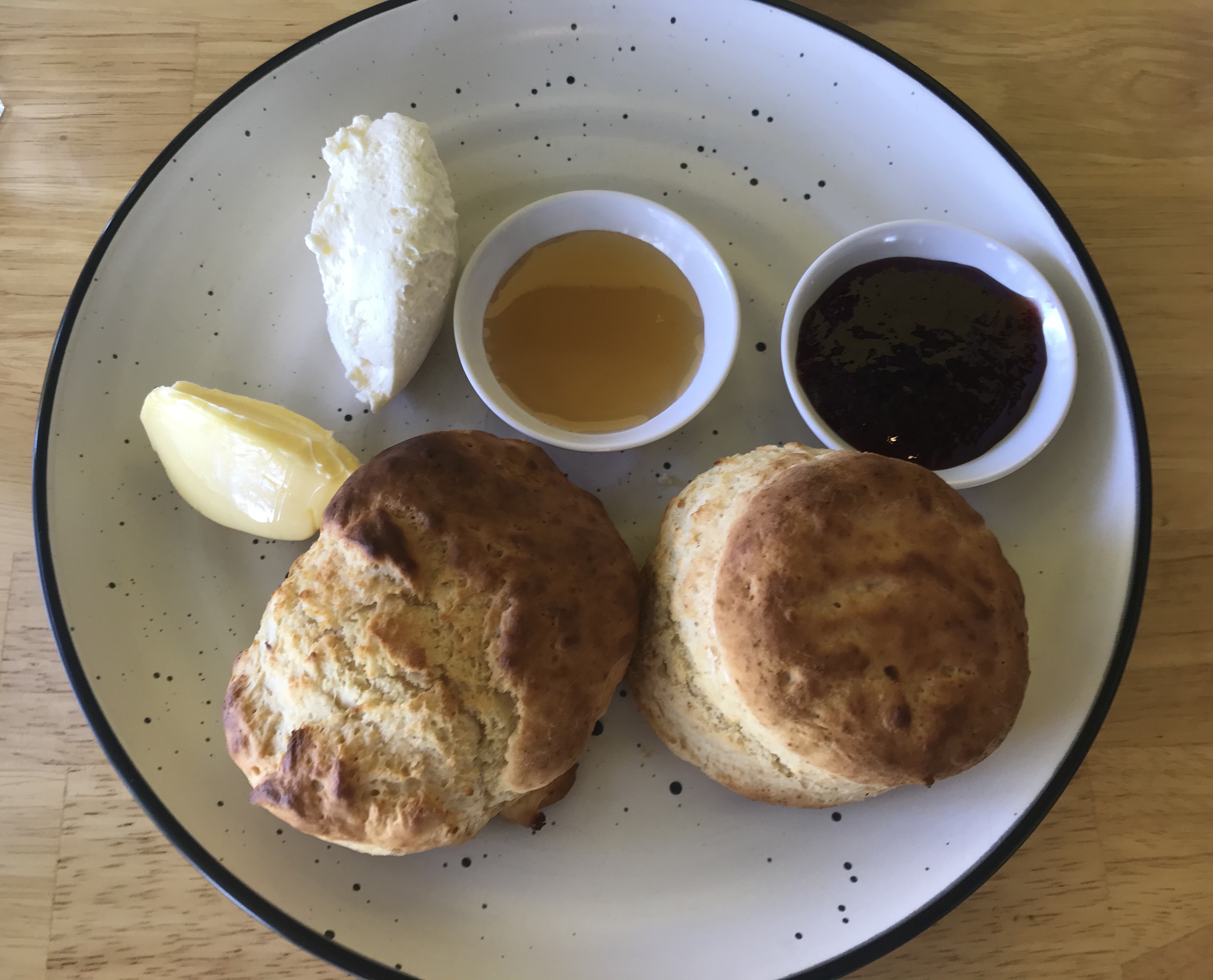 We opted for the scones and a coffee each and were treated with an unusual selection of toppings. Here, instead of just jam and cream, there is fresh butter, apple and cinnamon infused honey, homemade plum jam and whipped cream. The scones were a generous size allowing for them to be cut into quarters to enjoy each different topping.