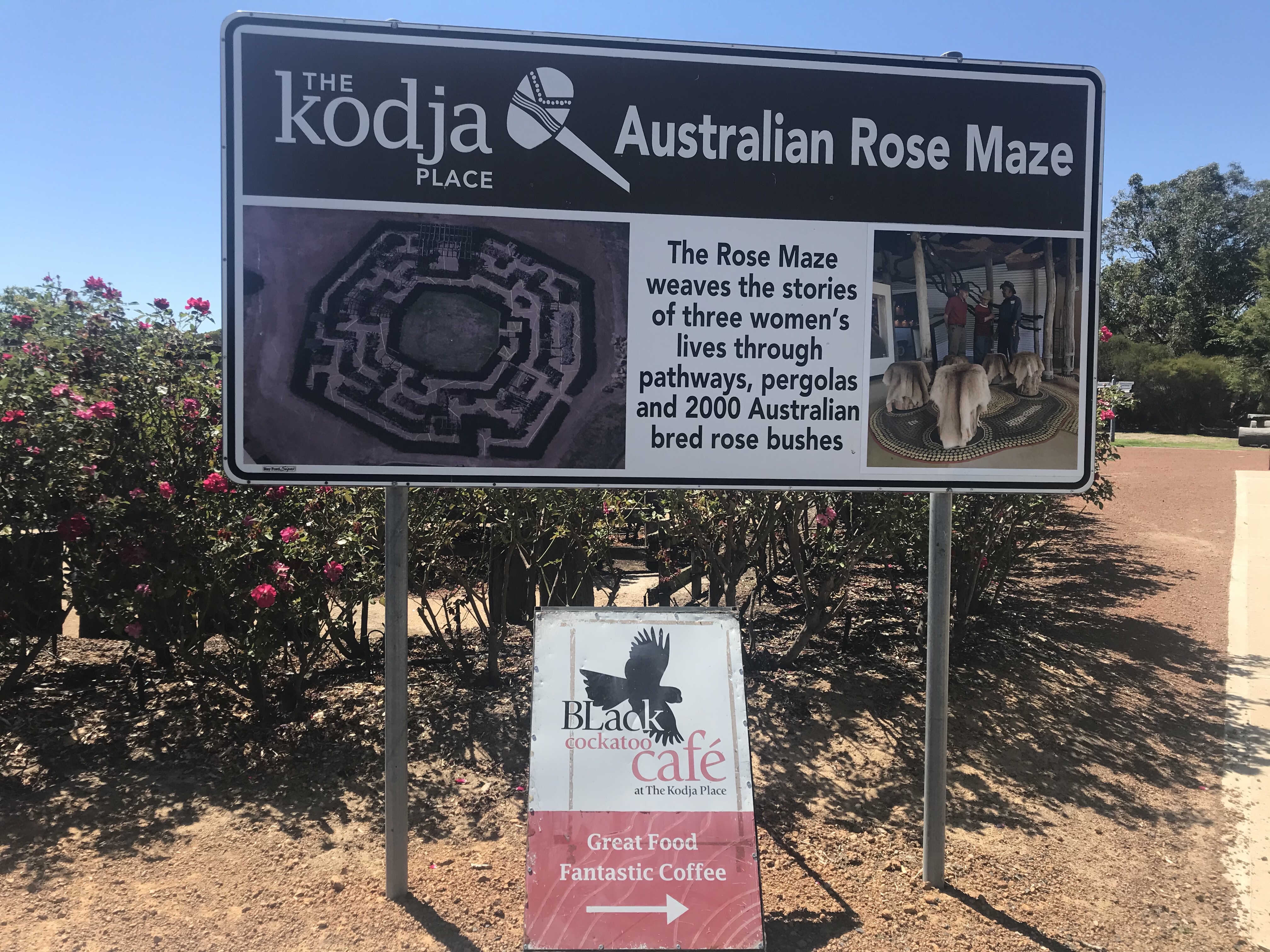 We made one significant stop in Kojonup. ‘Kodja’ refers to the stone axe made by Aboriginal people from the stone in this area. We had been recommended the Black cockatoo cafe where we enjoyed a coffee and homemade sausage roll before checking out the native rose bush maze. This followed the story of three local women and would be very interesting if you had the time to read all the information.
