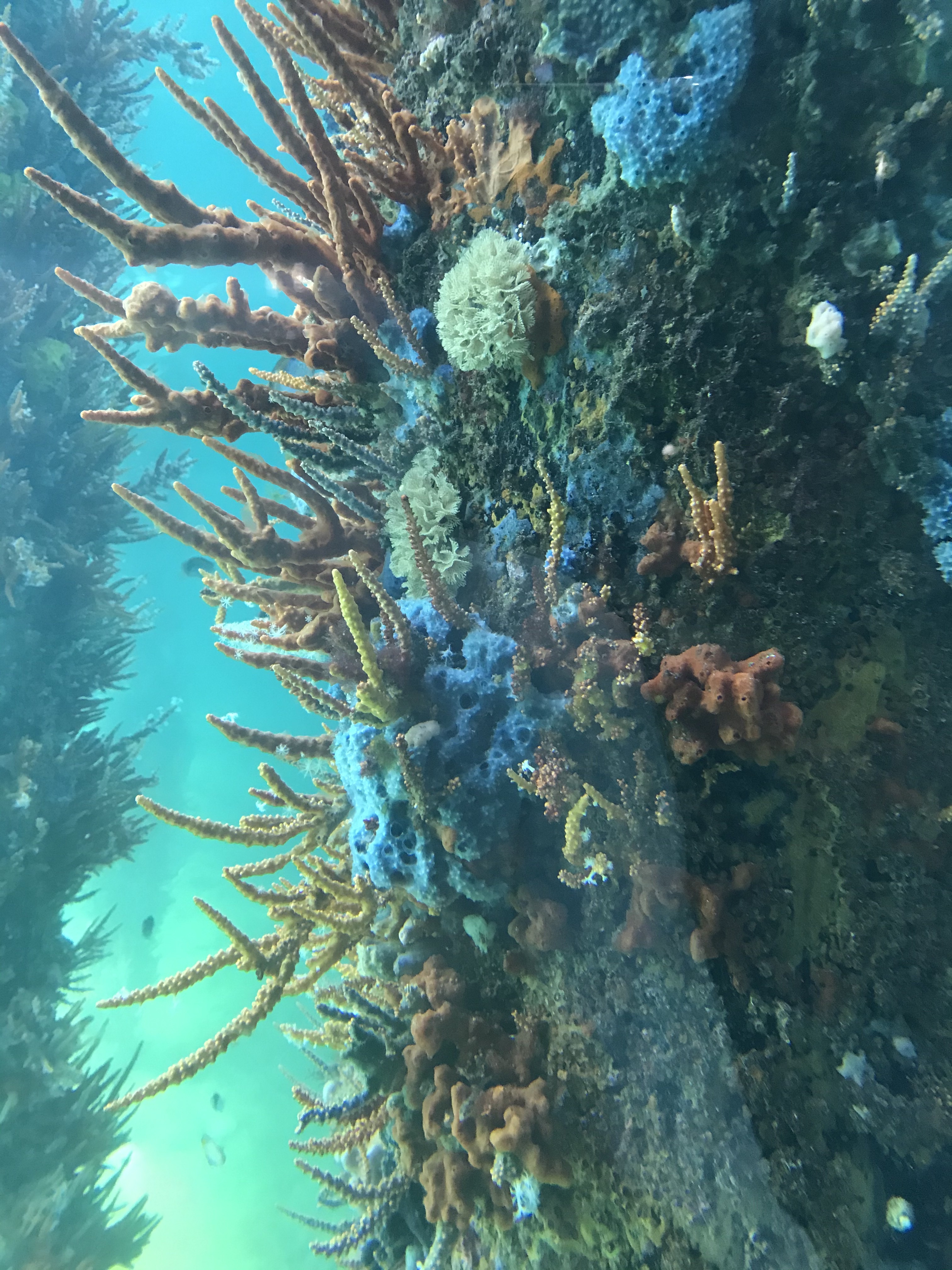 The minute my head entered the water, the worries of the week left and I entered a world where I could be completely free. First up I visited a small friend from a few weeks ago. On the first pylon right near the platform there is a collection of corals that form holes……… and in the holes, live blenny fish. I have always been intrigued by these fish, I first came across them many years ago snorkelling with my Dad. They are so easy to overlook but so interesting to watch should you see one. At first all you can see is a tiny pair of eyes looking at you but as you dive down they often come out of their hole just a little way to greet you, seemingly just as curious about us as we are of them. I introduced my family and friends to Mr Blenny before we swam off in a group towards the spectacular pylons and the underwater observatory.