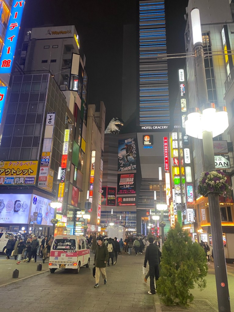 We enjoyed a sushi meal before wandering out onto the street in search of Godzilla. Amazingly, as we walked out of the restaurant we bumped into Master 18’s friend from Busselton! With 3.6 million people passing through the nearby train station every day, how do you run into someone you know??! The world freaks me out sometimes!